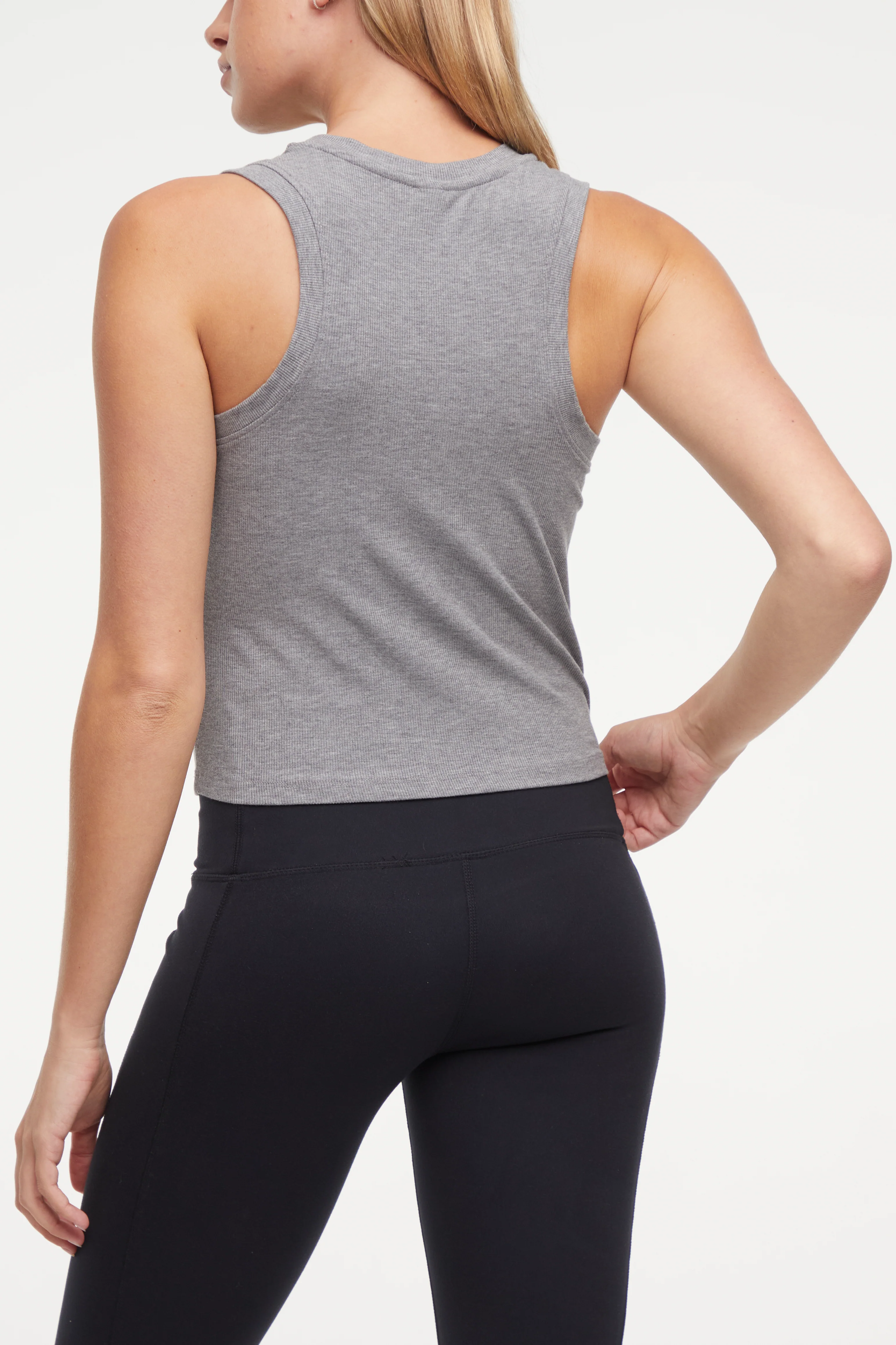 A cute, comfy top for anything on your agenda, this soft rib knit tank features a fitted silhouette, a classic crew neckline, and studio-to-street versatility that can take it from cycling sesh to pottery class.